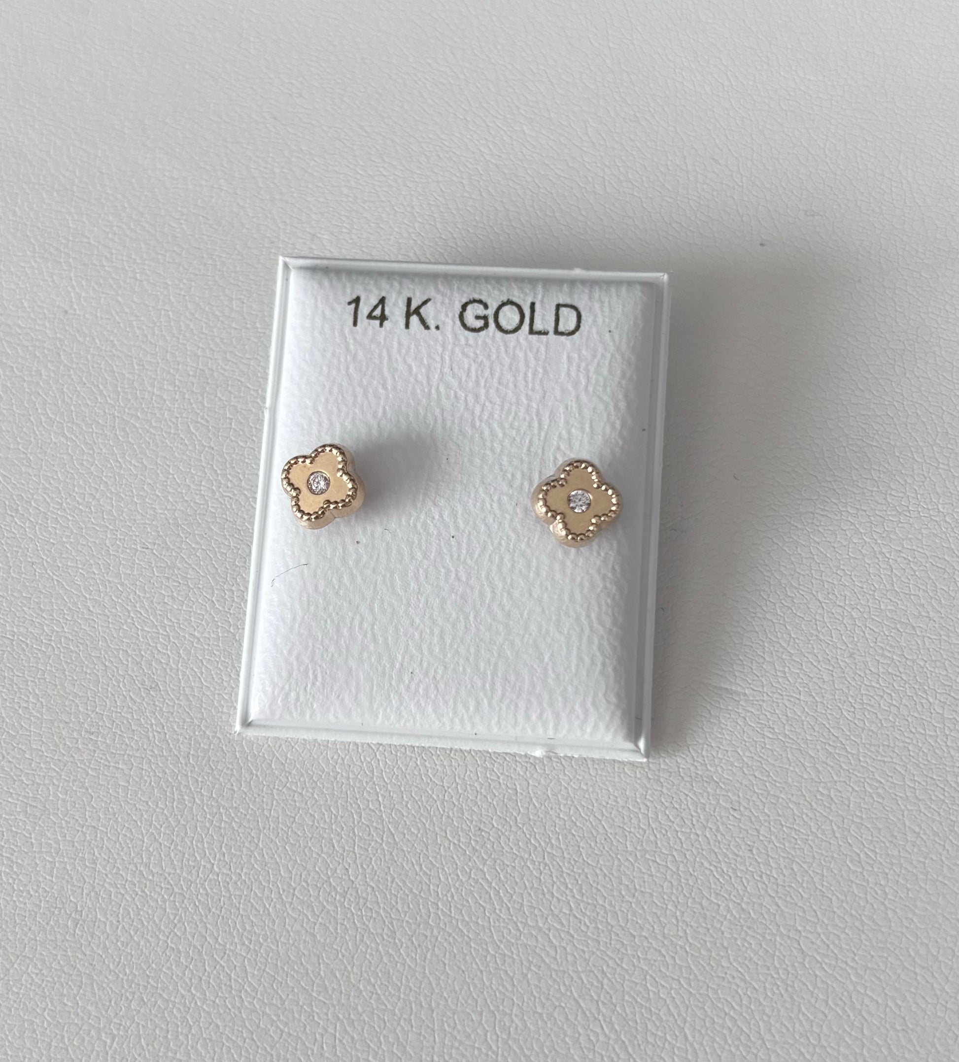 Tiny Clover Flower Zirconia 14K Solid Gold Earrings.